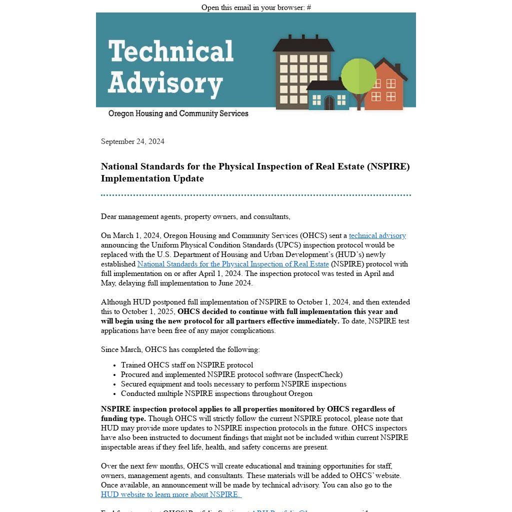 On March 1, 2024, Oregon Housing and Community Services (OHCS) sent a technical advisory announcing the Uniform Physical Condition Standards (UPCS) inspection protocol would be replaced with the U.S. Department of Housing and Urban Development’s (HUD’s) newly established National Standards for the Physical Inspection of Real Estate (NSPIRE) protocol with full implementation on or after April 1, 2024. The inspection protocol was tested in April and May, delaying full implementation to June 2024.