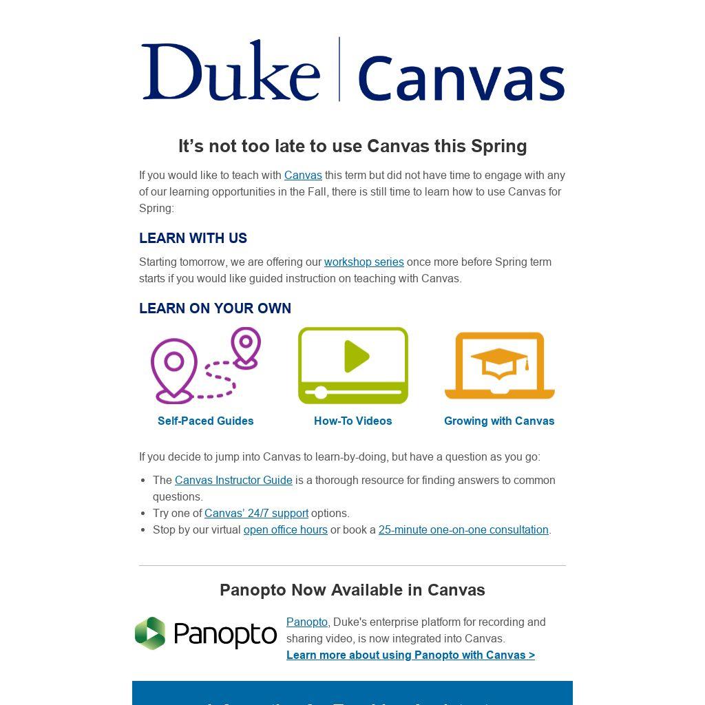 If you would like to teach with Canvas this term but did not have time to engage with any of our learning opportunities in the Fall, there is still time to learn how to use Canvas for Spring:
