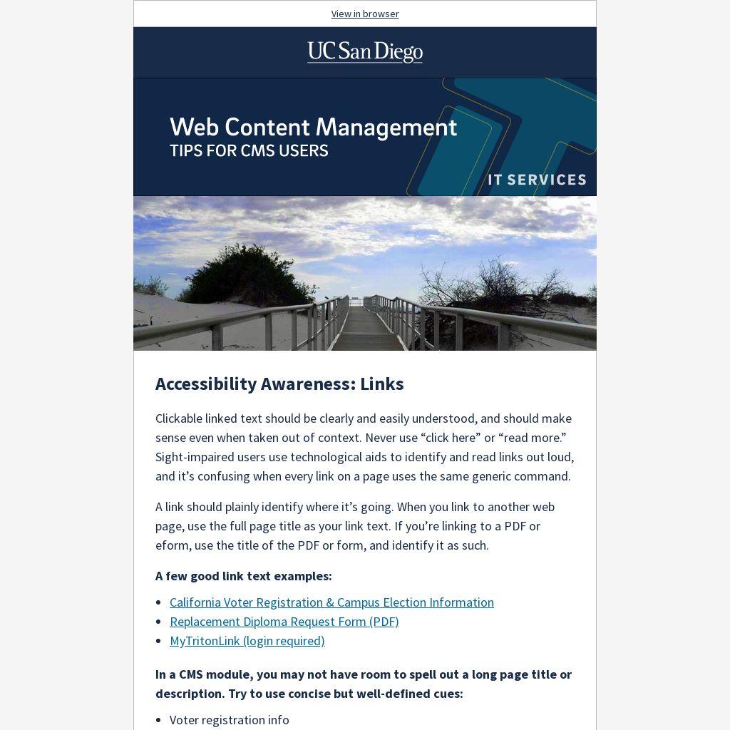 Clickable linked text should be clearly and easily understood, and should make sense even when taken out of context. Never use “click here” or “read more.” Sight-impaired users use technological aids to identify and read links out loud, and it’s confusing when every link on a page uses the same generic command.