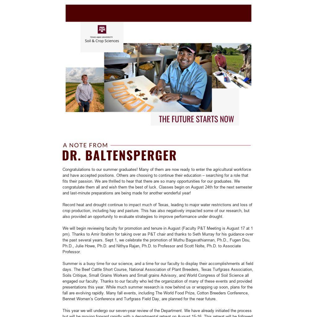 Summer is a busy time for our science, and a time for our faculty to display their accomplishments at field days. The Beef Cattle Short Course, National Association of Plant Breeders, Texas Turfgrass Association, Soils Critique, Small Grains Workers and Small grains Advisory, and World Congress of Soil Science all engaged our faculty. Thanks to our faculty who led the organization of many of these events and provided presentations this year. While much summer research is now behind us or wrapping up soon, plans for the fall are evolving rapidly. Many fall events, including The World Food Prize, Cotton Breeders Conference, Bennet Women’s Conference and Turfgrass Field Day, are planned for the near future.