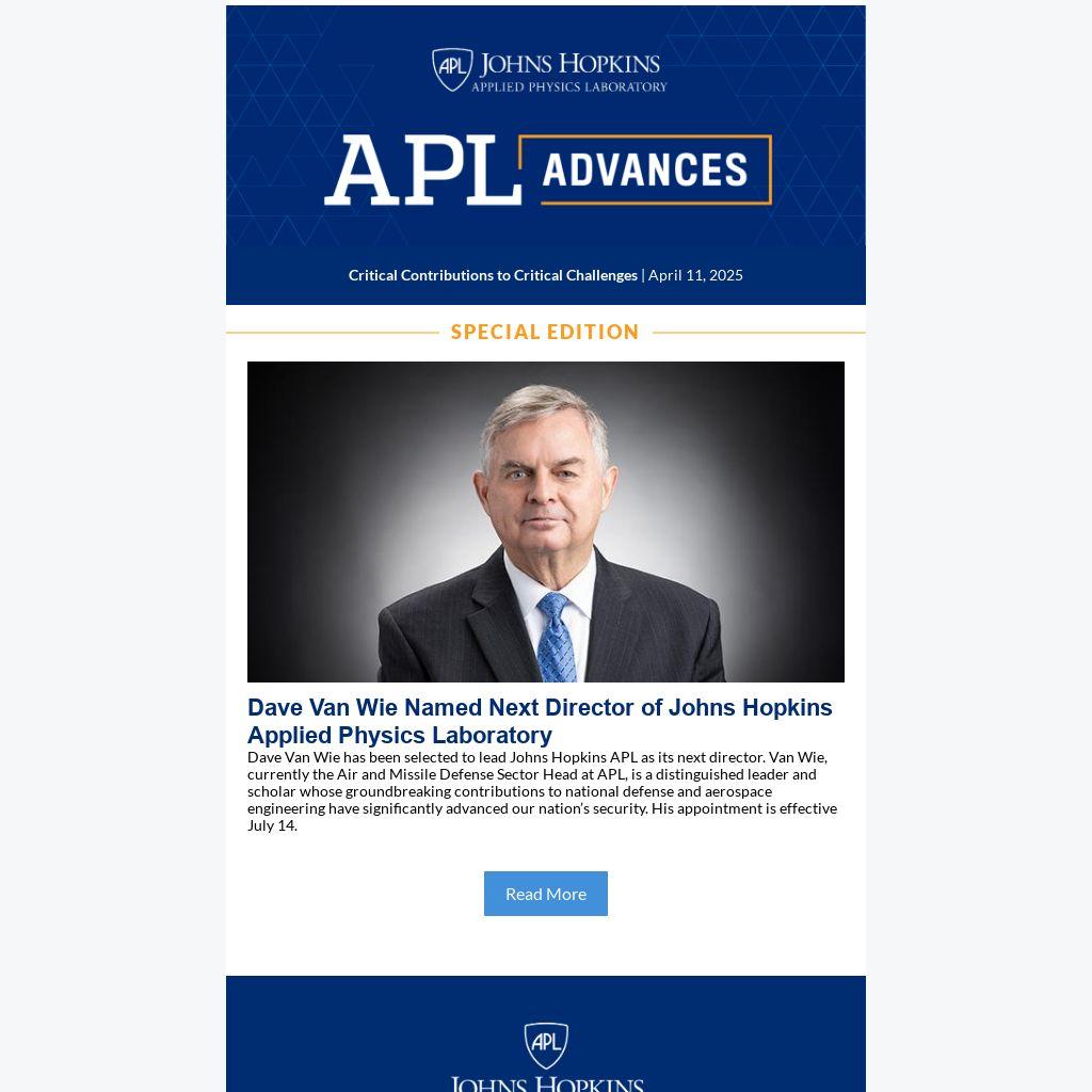 In this issue: Dave Van Wie has been selected to lead Johns Hopkins APL