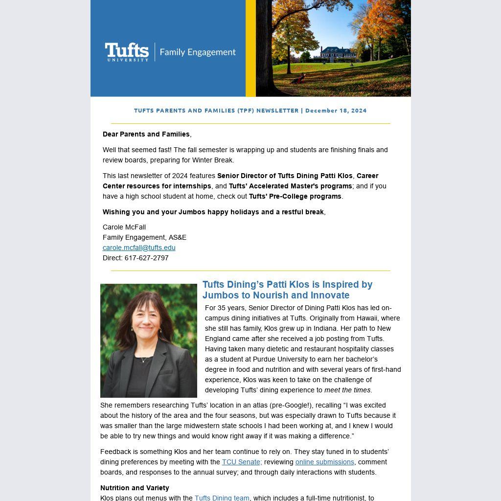 This last newsletter of 2024 features Senior Director of Tufts Dining Patti Klos, Career Center resources for internships, and Tufts' Accelerated Master's programs; and if you have a high school student at home, check out Tufts' Pre-College programs.
