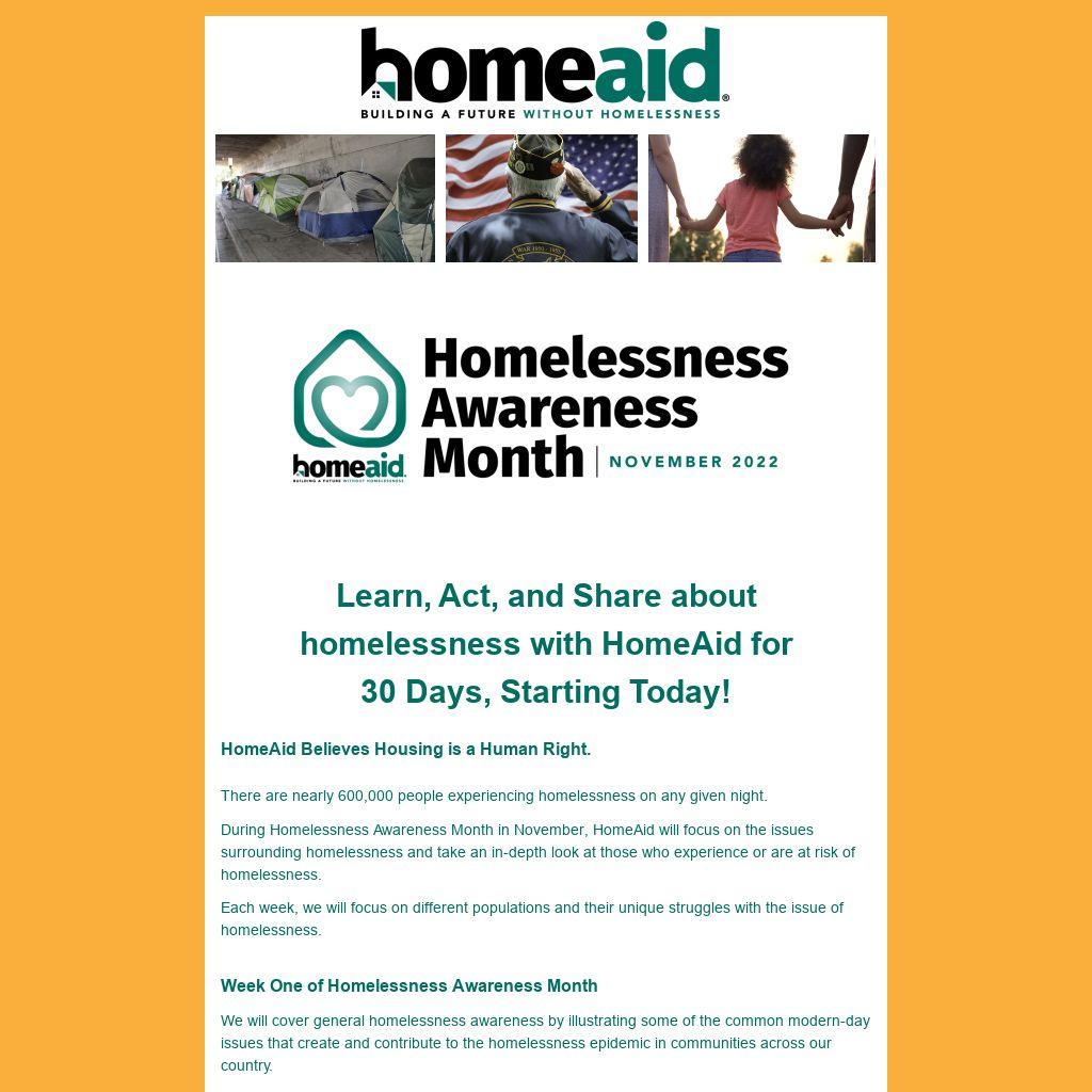 During Homelessness Awareness Month in November, HomeAid will focus on the issues surrounding homelessness and take an in-depth look at those who experience or are at risk of homelessness.