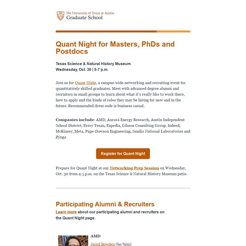 Join us for Quant Night, a campus-wide networking and recruiting event for quantitatively skilled graduates. Meet with advanced degree alumni and recruiters in small groups to learn about what it’s really like to work there, how to apply and the kinds of roles they may be hiring for now and in the future. Recommended dress code is business casual.