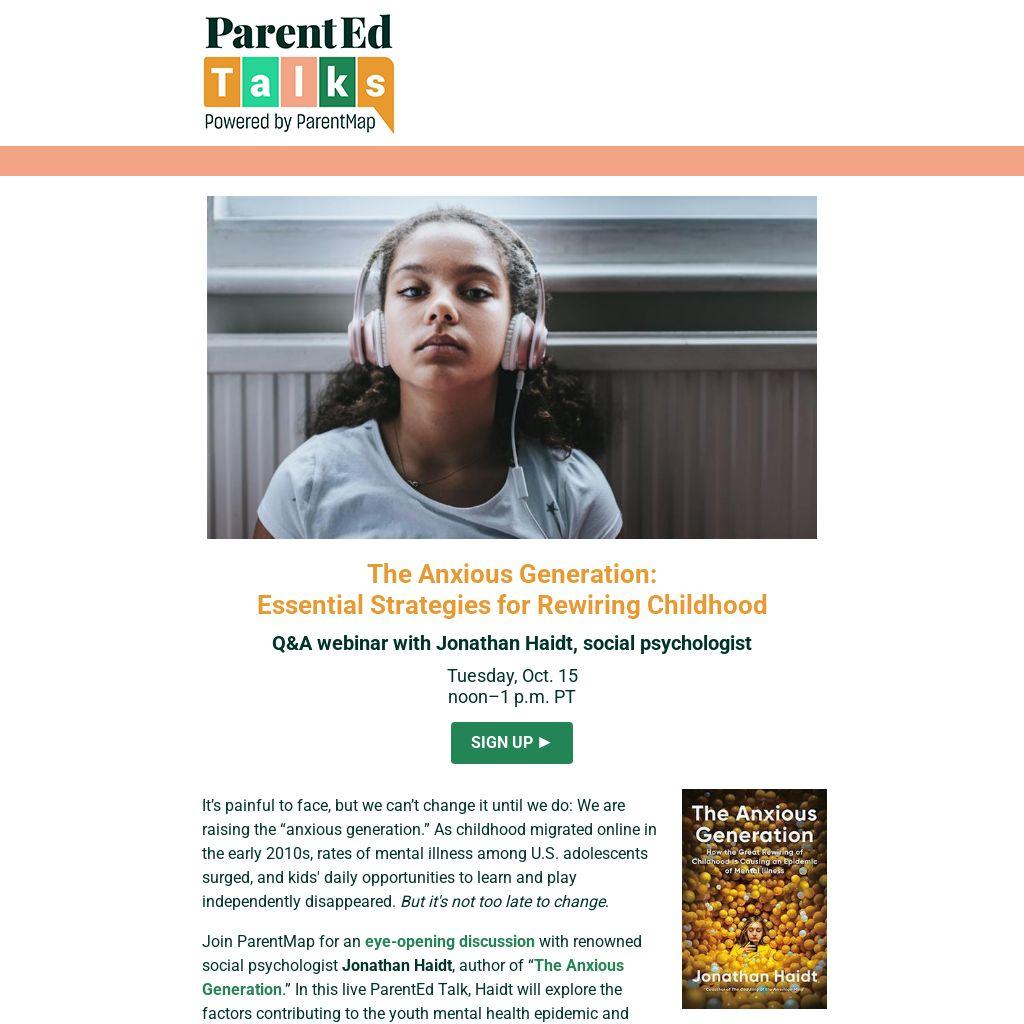 Join ParentMap for an eye-opening discussion with renowned social psychologist Jonathan Haidt, author of “The Anxious Generation.” In this live ParentEd Talk, Haidt will explore the factors contributing to the youth mental health epidemic and practical steps we can take to protect our children.
