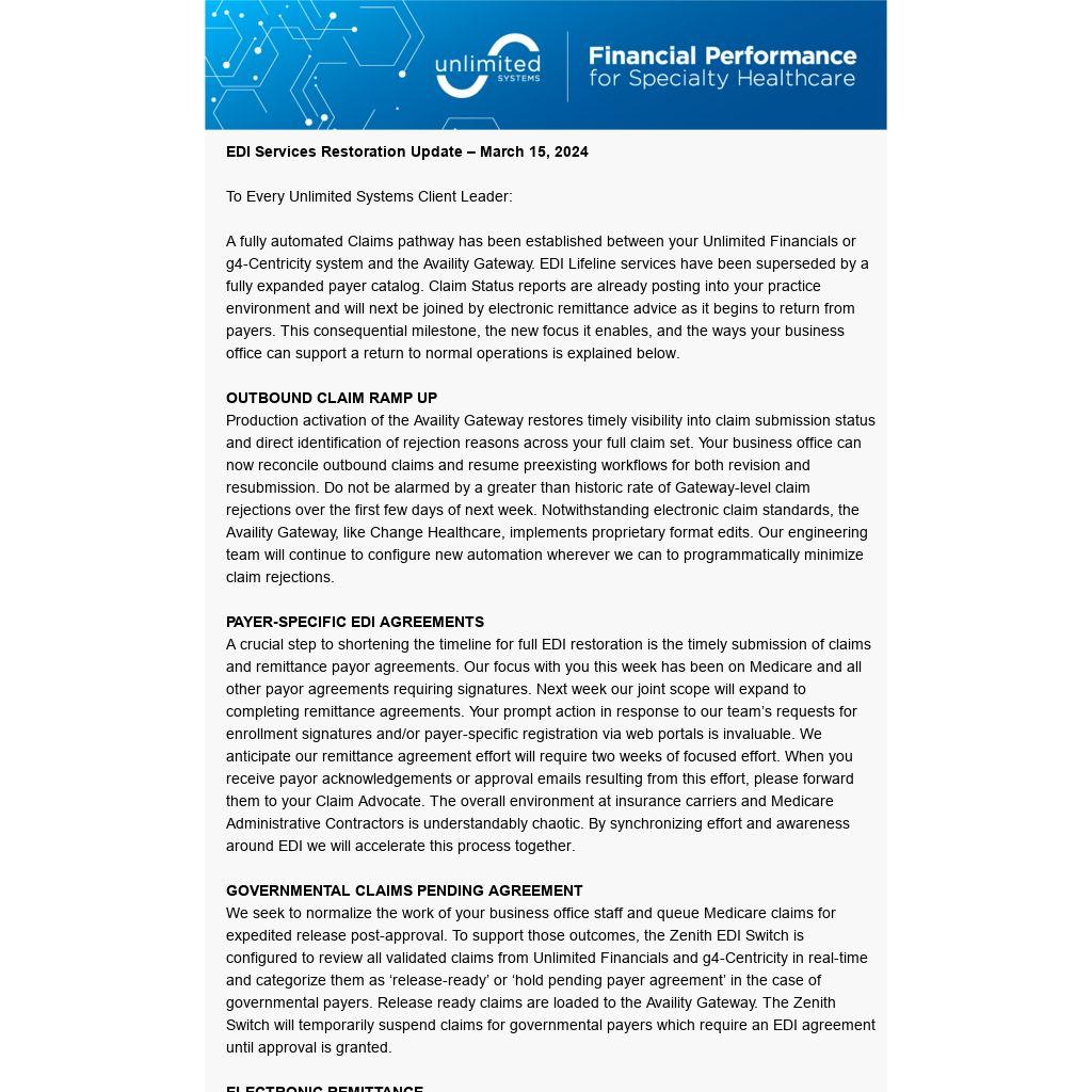 Unlimited’s leadership group maintains regular dialog with Optum’s representatives who seek to restore the Change Healthcare pathway. This afternoon the CEO of Optum’s Insight Software and Network business hosted a progress update call. He emphasized a three-phase approach: (1) connectivity; (2) testing; and (3) service resumption. While the week of March 18th was noted as a starting point, no firm dates were offered for these milestones. The timeline and specifics of Optum’s approach were described as “difficult to provide at this point”. Unlimited’s commitment, exemplified by our Zenith Switch, is to provide redundant pathways for EDI resiliency. While ultimate restoration of a Change Healthcare pathway supports this outcome, the prudence of rapid movement to secure Availity-specific payer agreements is clear.
