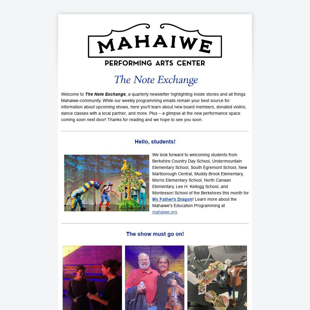 Welcome to The Note Exchange, a quarterly newsletter highlighting inside stories and all things Mahaiwe-community. While our weekly programming emails remain your best source for information about upcoming shows, here you'll learn about new board members, donated violins, dance classes with a local partner, and more. Plus – a glimpse at the new performance space coming soon next door! Thanks for reading and we hope to see you soon.