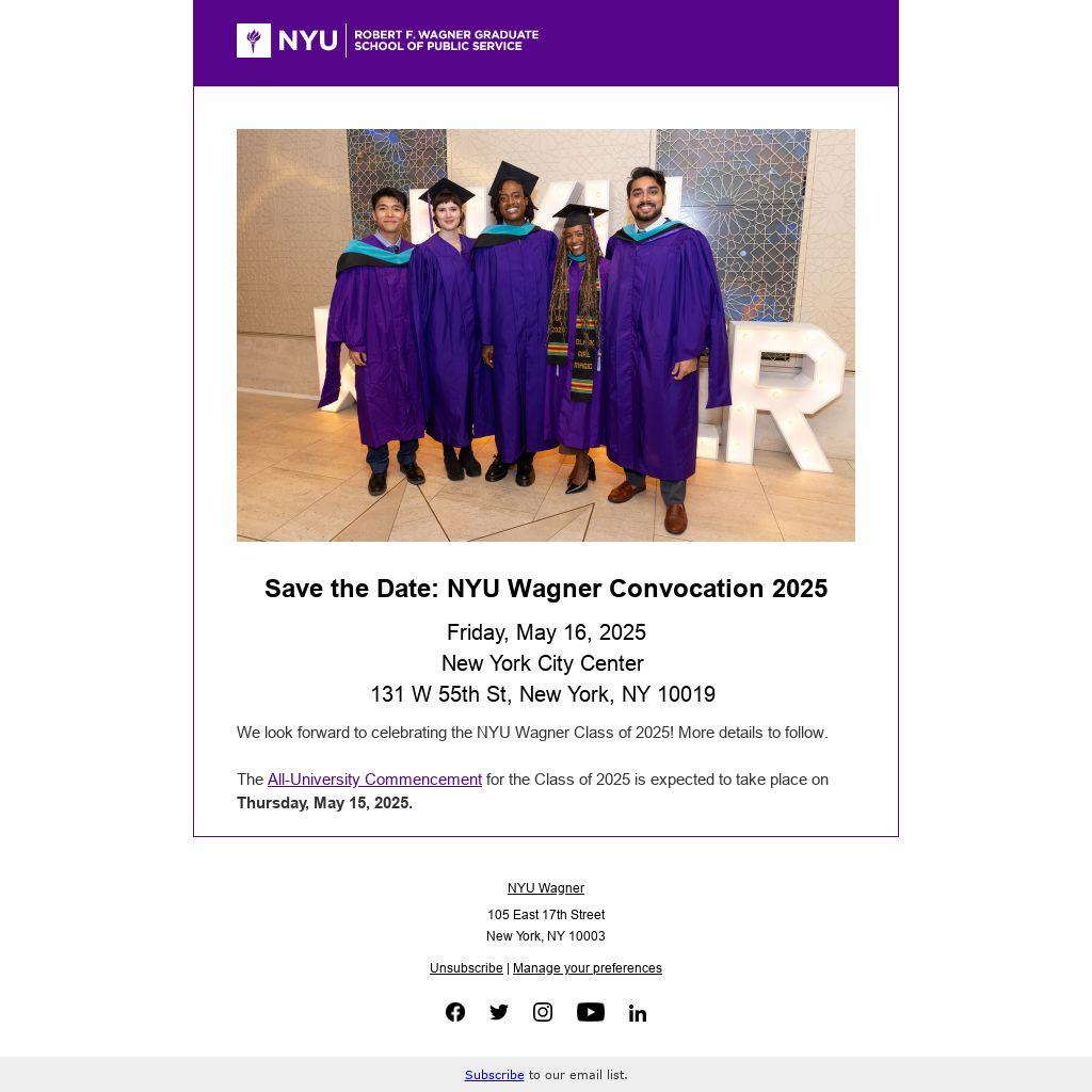 We look forward to celebrating the NYU Wagner Class of 2025! More details to follow.