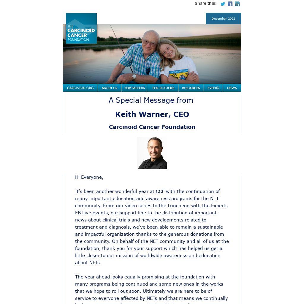 It’s been another wonderful year at CCF with the continuation of many important education and awareness programs for the NET community. From our video series to the Luncheon with the Experts FB Live events, our support line to the distribution of important news about clinical trials and new developments related to treatment and diagnosis, we’ve been able to remain a sustainable and impactful organization thanks to the generous donations from the community. On behalf of the NET community and all of us at the foundation, thank you for your support which has helped us get a little closer to our mission of worldwide awareness and education about NETs.