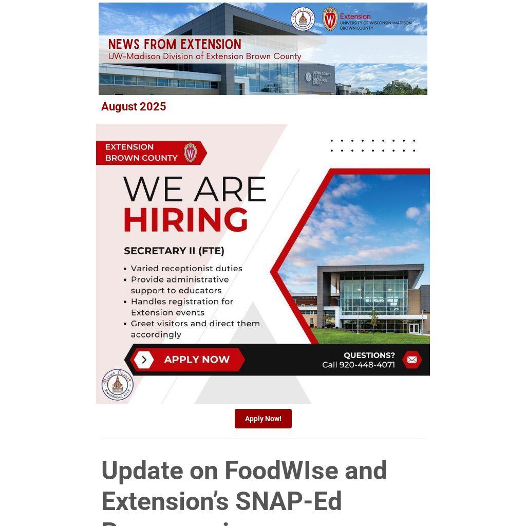 Extension’s commitment to your community remains and we will continue to bring university resources to residents in your area across our program areas. Please reach out to your Nutrition Administrator, Liliana Ramirez at liliana.ramirezgonzalez@wisc.edu or Kathleen McKee Area Extension Director, with your questions.