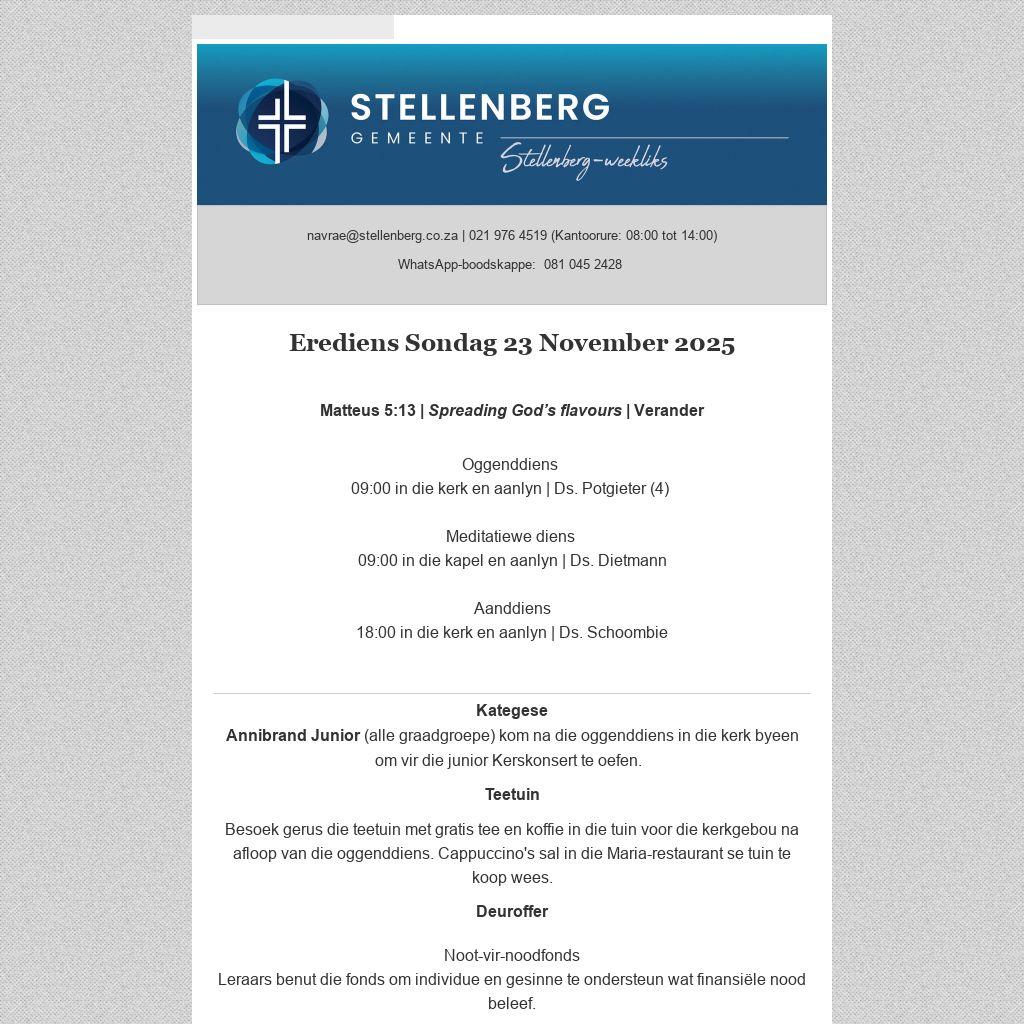 Plaas gerus ’n advertensie in die Stellenberg-weekliks. Die nuusblad word tans weekliks elektronies aan 2 500 persone gestuur en is ook op die gemeente se webwerf beskikbaar. Advertensies sal slegs aanlyn beskikbaar wees en word nie in gedrukte formaat uitgegee nie. Lees meer . . .