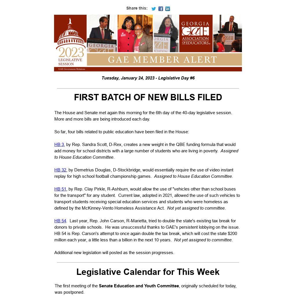 HB 54. Last year, Rep. John Carson, R-Marietta, tried to double the state's existing tax break for donors to private schools. He was unsuccessful thanks to GAE's persistent lobbying on the issue. HB 54 is Rep. Carson's attempt to once again double the tax break, which will cost the state $200 million each year, a little less than a billion in the next 10 years. Not yet assigned to committee.