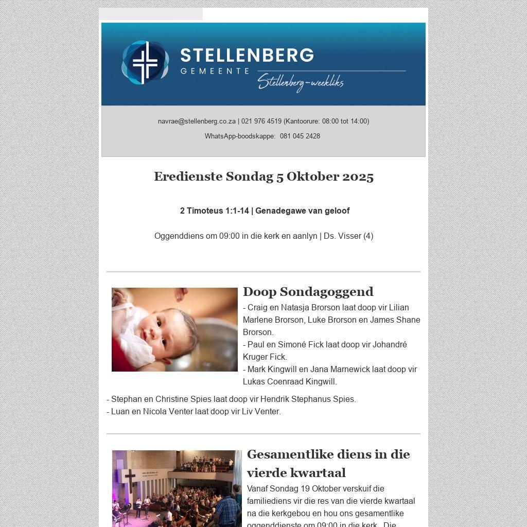 Ons sien uit na die die gesamentlike dienste, want nuwe energie word geskep wanneer gesinne met jong kinders saam met die res van die gemeente in die kerk byeenkom en ons saam as gelowiges in die teenwoordigheid van God aanbid.