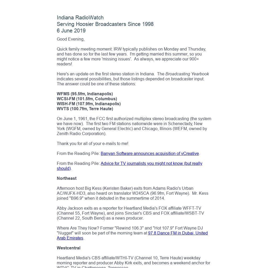 Indiana RadioWatch subscriptions are free. To subscribe, send an e-mail to irw@well.com and we'll add you. After publication, we archive Indiana RadioWatch on the Indiana Radio Archive at http://www.indianaradio.net. Please e-mail us your news stories and employment opportunities.