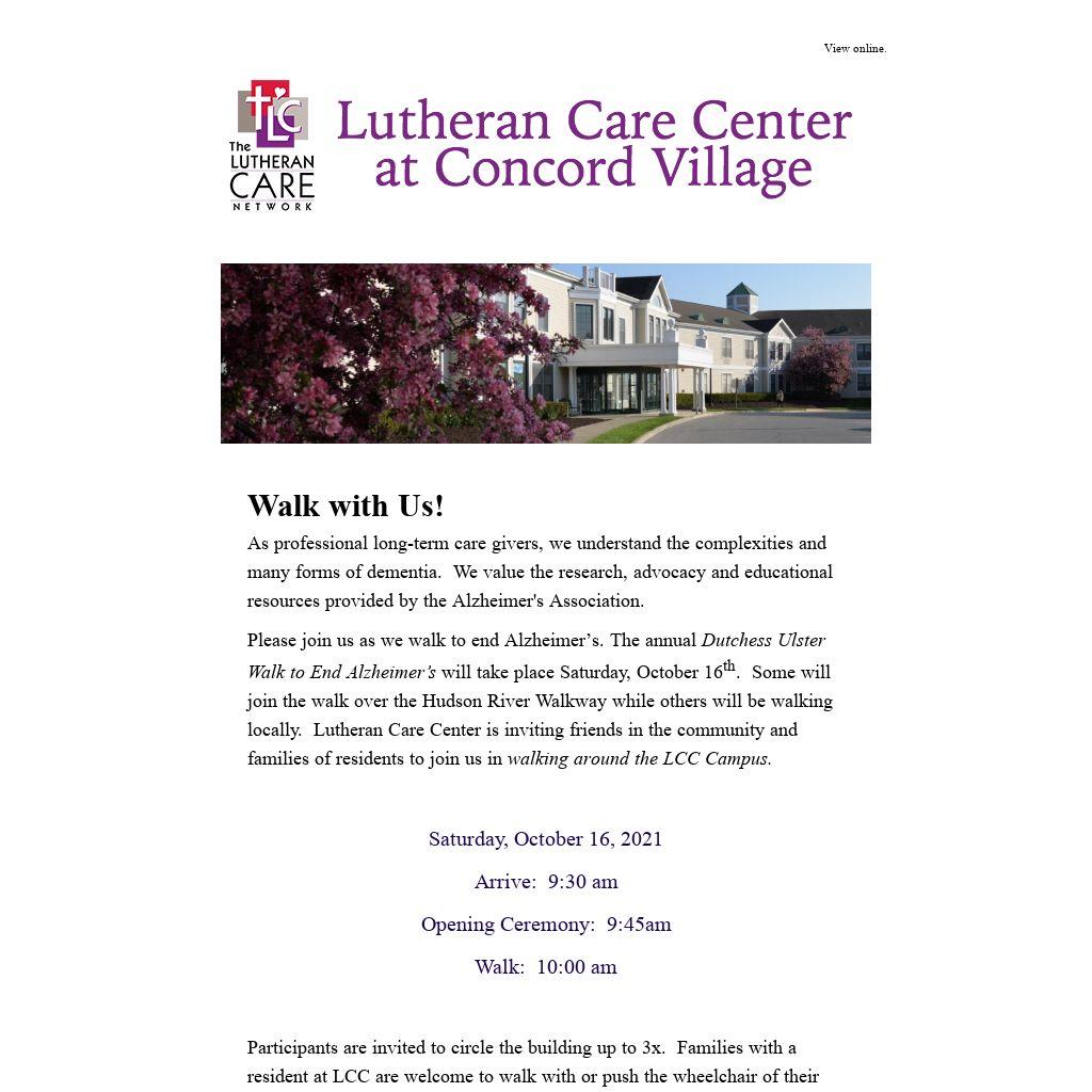 Please join us as we walk to end Alzheimer’s. The annual Dutchess Ulster Walk to End Alzheimer’s will take place Saturday, October 16th. Some will join the walk over the Hudson River Walkway while others will be walking locally. Lutheran Care Center is inviting friends in the community and families of residents to join us in walking around the LCC Campus.