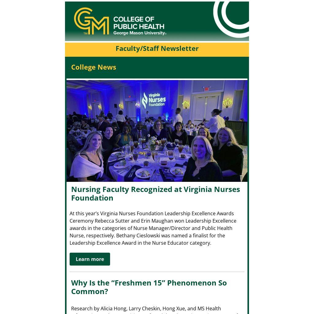 Several faculty successfully received continuation funding, including Anna Pollack (GCH) and Jenna Krall (GCH) for their NIH-funded "Endometriosis Diagnosis and Subtypes, Reproductive History, and Cardiovascular Disease," Michael Bloom (GCH) for his NIH-funded project "A South Carolina ECHO Pregnancy COHORT," and Rebecca Sutter for her Northern Virginia Family Services/DHHS-funded project "Survivors of Torture" and her HRSA-funded project, "Opioid Impacted Family Support Training."