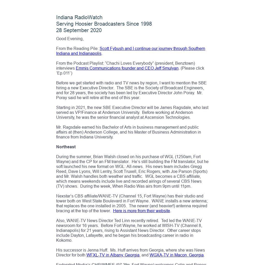 Before we get started with radio and TV news by region, I want to mention the SBE hiring a new Executive Director. The SBE is the Society of Broadcast Engineers, and for 28 years, the society has been led by Executive Director John Poray. Mr. Poray said he will retire at the end of this year.