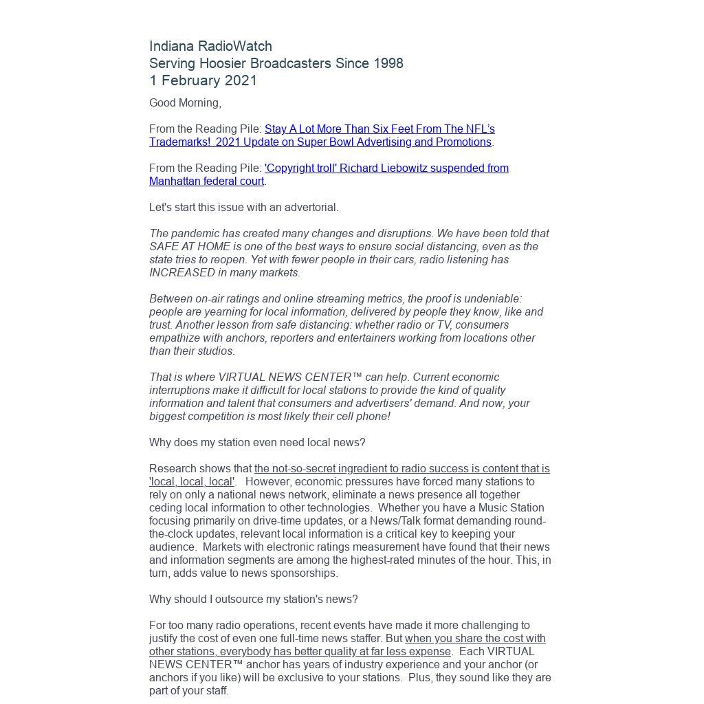 Of course, VIRTUAL NEWS CENTER™ can do the normal beat calls and web site checks. We also get on relevant email and fax distribution lists for your station. In a Corona world, we've seen that technology makes it simple for virtually every staffer to work from outside the building. In many situations, traffic and billing is handled somewhere else, and now you can have a larger sounding newsroom and not worry about all the issues that go along with a local hire.