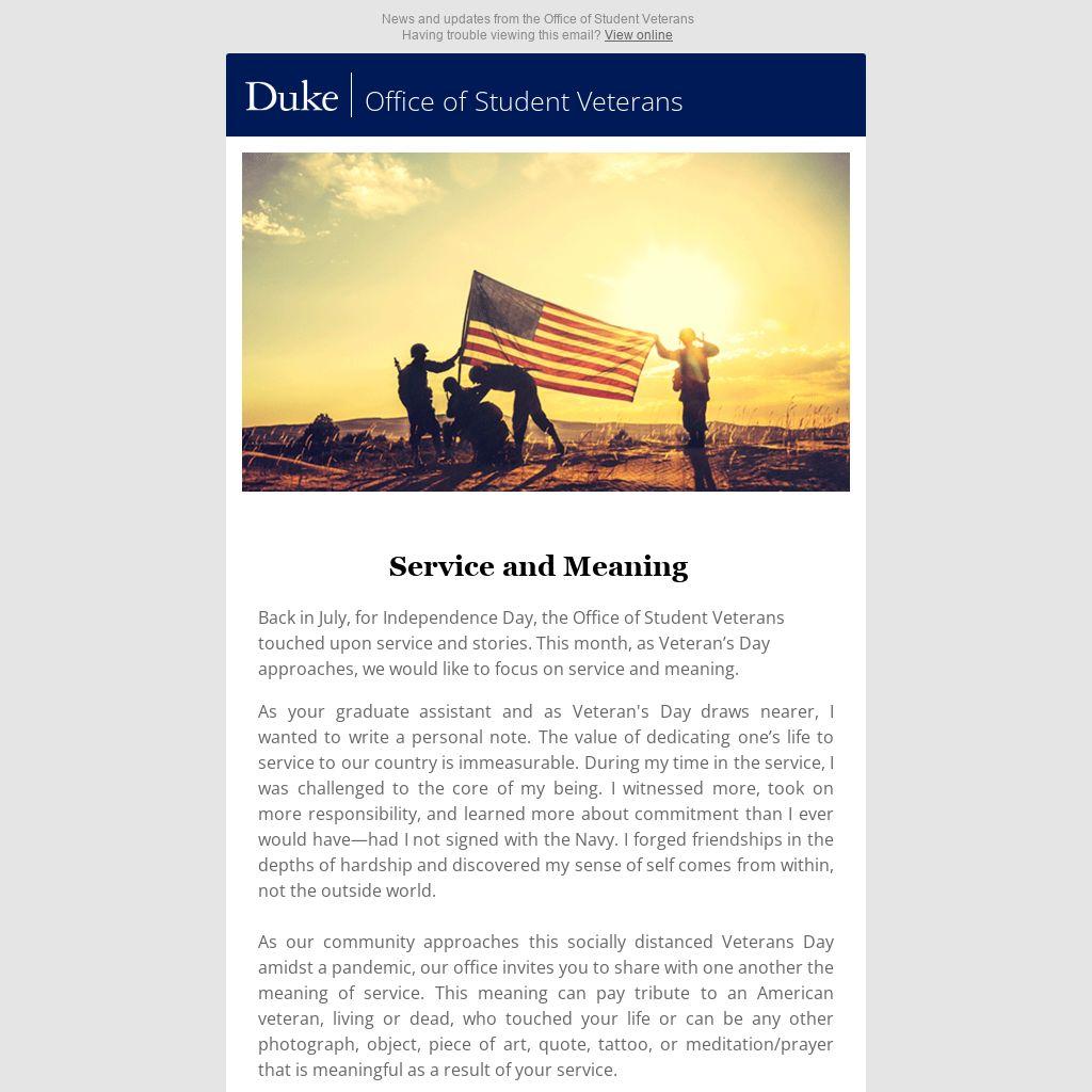 Back in July, for Independence Day, the Office of Student Veterans touched upon service and stories. This month, as Veteran’s Day approaches, we would like to focus on service and meaning.