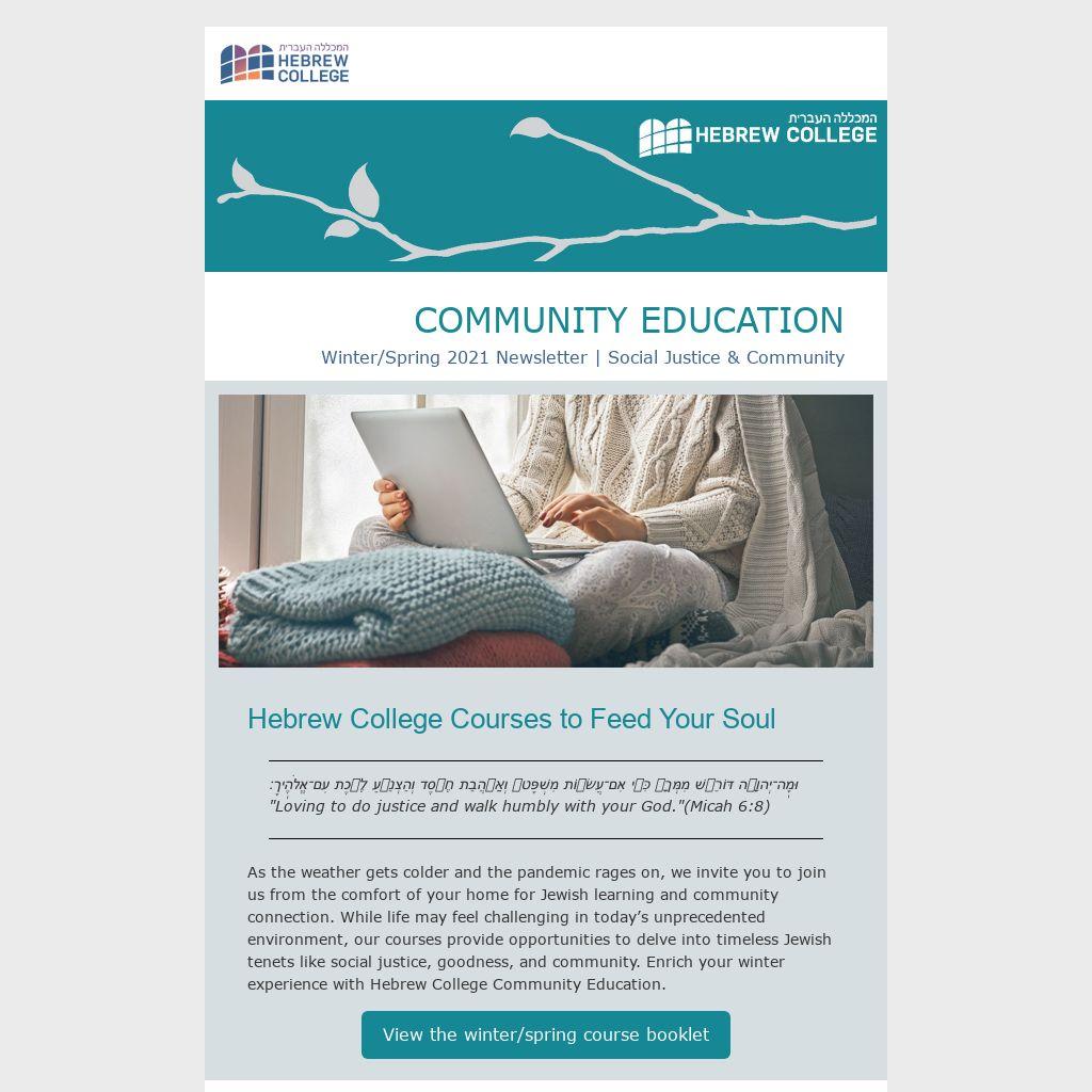 As the weather gets colder and the pandemic rages on, we invite you to join us from the comfort of your home for Jewish learning and community connection. While life may feel challenging in today’s unprecedented environment, our courses provide opportunities to delve into timeless Jewish tenets like social justice, goodness, and community. Enrich your winter experience with Hebrew College Community Education.