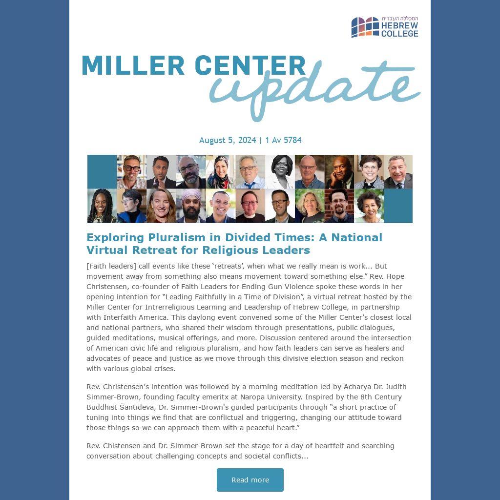 [Faith leaders] call events like these ‘retreats’, when what we really mean is work... But movement away from something also means movement toward something else.” Rev. Hope Christensen, co-founder of Faith Leaders for Ending Gun Violence spoke these words in her opening intention for “Leading Faithfully in a Time of Division”, a virtual retreat hosted by the Miller Center for Intrerreligious Learning and Leadership of Hebrew College, in partnership with Interfaith America. This daylong event convened some of the Miller Center’s closest local and national partners, who shared their wisdom through presentations, public dialogues, guided meditations, musical offerings, and more. Discussion centered around the intersection of American civic life and religious pluralism, and how faith leaders can serve as healers and advocates of peace and justice as we move through this divisive election season and reckon with various global crises.