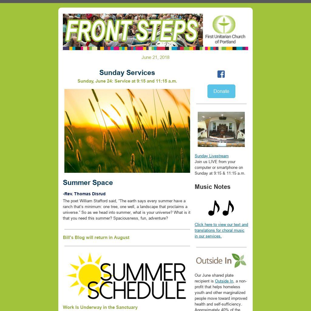 Do You Have an Item for E-news or the Sunday Bulletin?If you have an item you’d like published in our weekly Front Steps (eNews) or the Sunday Bulletin, please submit it to: