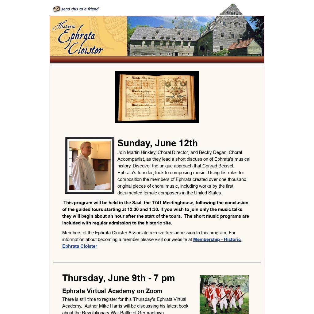 Join Martin Hinkley, Choral Director, and Becky Degan, Choral Accompanist, as they lead a short discussion of Ephrata’s musical history. Discover the unique approach that Conrad Beissel, Ephrata’s founder, took to composing music. Using his rules for composition the members of Ephrata created over one-thousand original pieces of choral music, including works by the first documented female composers in the United States.