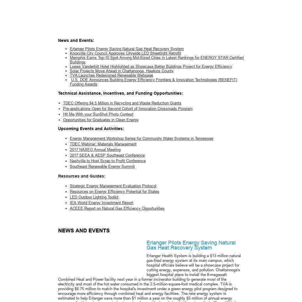 | Erlanger Pilots Energy Saving Natural Gas Heat Recovery System Erlanger Health System is building a $13 million natural gas-fired energy system at its main campus, which hospital officials believe will be a showcase project for cutting energy, expenses, and pollution. Chattanooga's biggest hospital plans to install the 8-megawatt Combined Heat and Power facility next year in a former incinerator building to generate most of the electricity and most of the hot water consumed in the 2.5-million-square-foot medical complex. TVA is providing $6.75 million to match the hospital's investment under a green energy pilot program designed to encourage more efficiency through combined heat and energy facilities. The new energy system is estimated to help Erlanger save more than $1 million a year on the roughly $5 million of annual energy expenses for the main campus to heat, cool and power the hospital and adjacent medical offices. With the aid of TVA in the pilot program, Erlanger's investment should pay off in less than four years. For more information, click here.