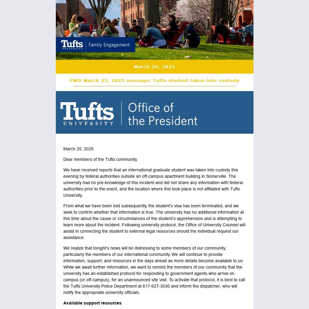 We have received reports that an international graduate student was taken into custody this evening by federal authorities outside an off-campus apartment building in Somerville. The university had no pre-knowledge of this incident and did not share any information with federal authorities prior to the event, and the location where this took place is not affiliated with Tufts University.