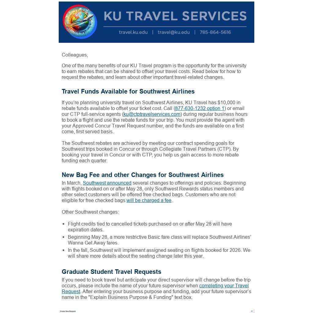 If you’re planning university travel on Southwest Airlines, KU Travel has $10,000 in rebate funds available to offset your ticket cost. Call (877-630-1232 option 1) or email our CTP full-service agents (ku@ctptravelservices.com) during regular business hours to book a flight and use the rebate funds for your trip. You must provide the agent with your Approved Concur Travel Request number, and the funds are available on a first come, first served basis.