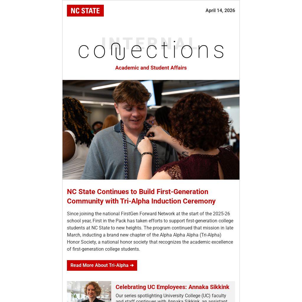| April 14, 2026 | | | | | | | NC State Continues to Build First-Generation Community with Tri-Alpha Induction Ceremony | | |
