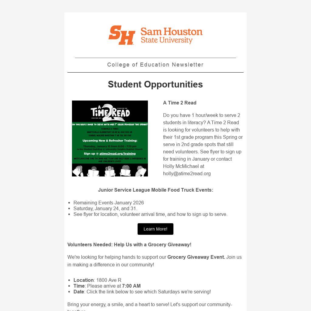 Do you have 1 hour/week to serve 2 students in literacy? A Time 2 Read is looking for volunteers to help with their 1st grade program this Spring or serve in 2nd grade spots that still need volunteers. See flyer to sign up for training in January or contact Holly McMichael at holly@atime2read.org