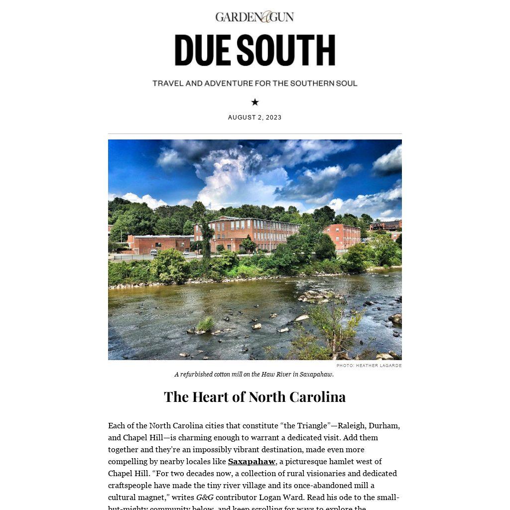 Each of the North Carolina cities that constitute “the Triangle”—Raleigh, Durham, and Chapel Hill—is charming enough to warrant a dedicated visit. Add them together and they’re an impossibly vibrant destination, made even more compelling by nearby locales like Saxapahaw, a picturesque hamlet west of Chapel Hill. “For two decades now, a collection of rural visionaries and dedicated craftspeople have made the tiny river village and its once-abandoned mill a cultural magnet,” writes G&G contributor Logan Ward. Read his ode to the small-but-mighty community below, and keep scrolling for ways to explore the Triangle’s big three.