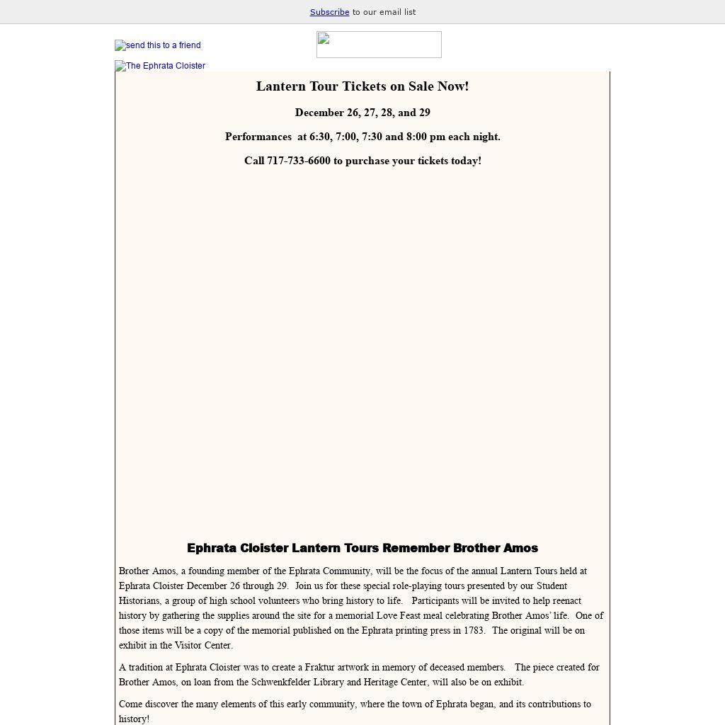 Brother Amos, a founding member of the Ephrata Community, will be the focus of the annual Lantern Tours held at Ephrata Cloister December 26 through 29. Join us for these special role-playing tours presented by our Student Historians, a group of high school volunteers who bring history to life. Participants will be invited to help reenact history by gathering the supplies around the site for a memorial Love Feast meal celebrating Brother Amos’ life. One of those items will be a copy of the memorial published on the Ephrata printing press in 1783. The original will be on exhibit in the Visitor Center.