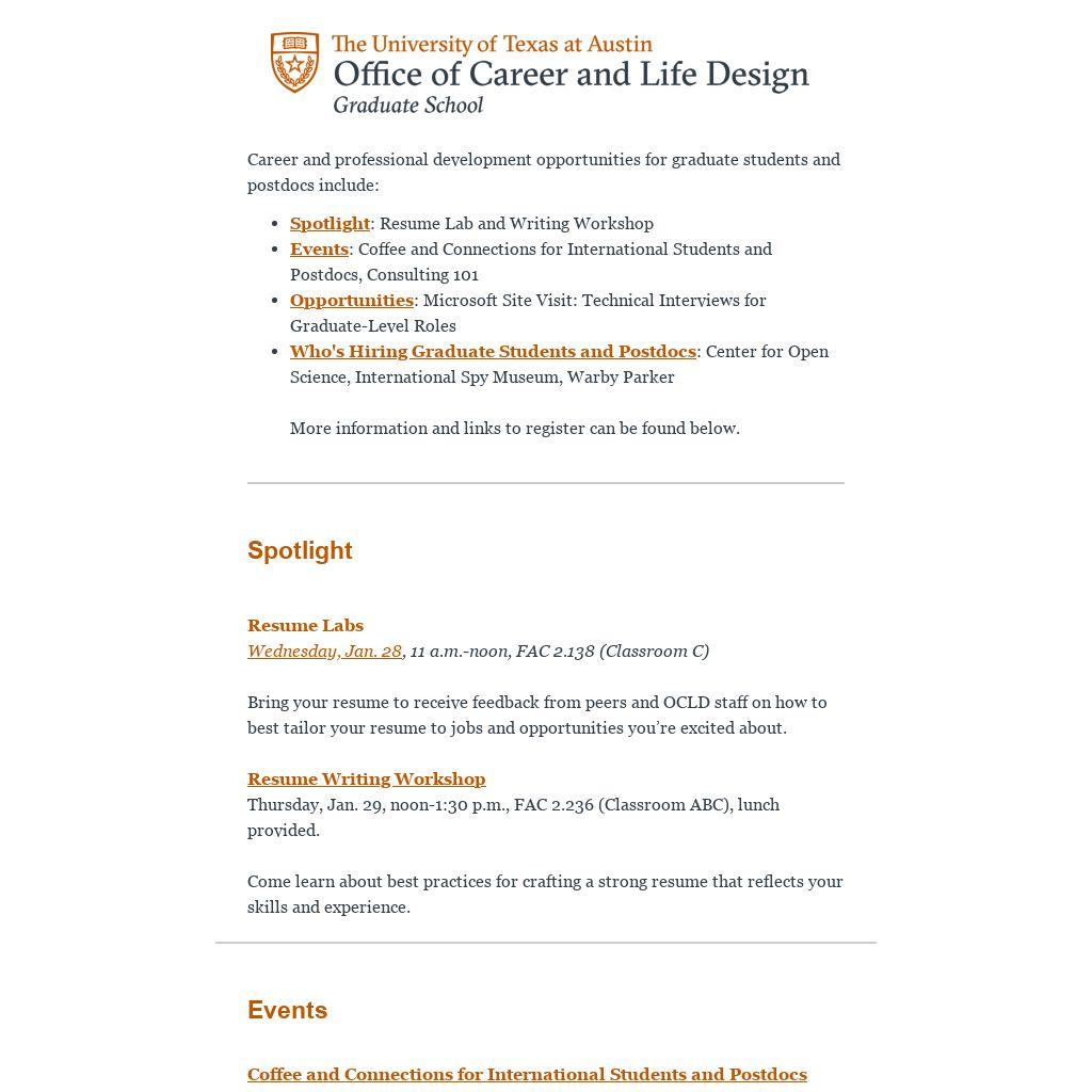 Resume Labs Wednesday, Jan. 28, 11 a.m.-noon, FAC 2.138 (Classroom C)