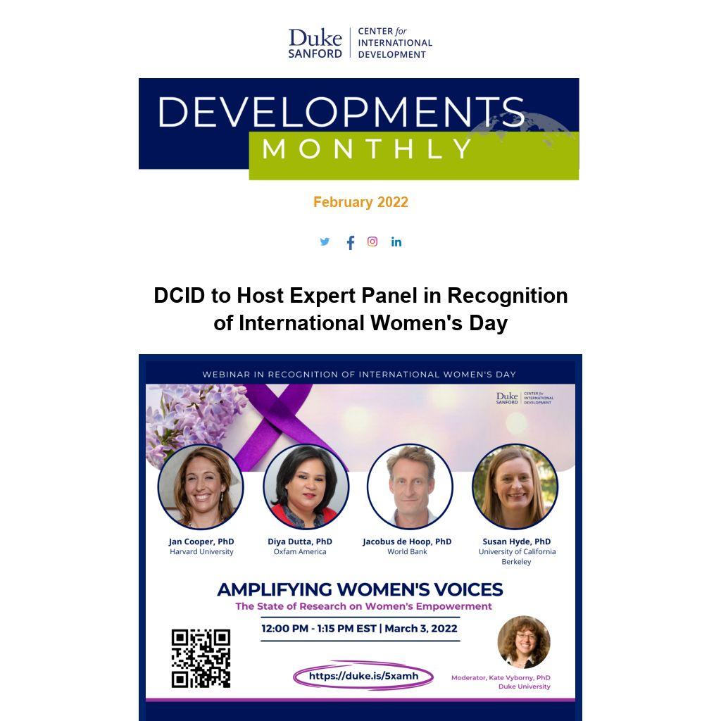 In recognition of International Women’s Day, DCID will host "Amplifying Women’s Voices: The State of Research on Women’s Empowerment" on Thursday, March 3 at 12:00 p.m.-1:15 p.m. EST. The webinar will feature experts from leading development organizations in a discussion about groundbreaking research on critical issues in women’s rights and international development.