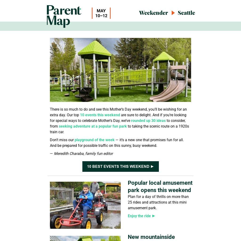 There is so much to do and see this Mother’s Day weekend, you’ll be wishing for an extra day. Our top 10 events this weekend are sure to delight. And if you’re looking for special ways to celebrate Mother's Day, we’ve rounded up 30 ideas to consider, from seeking adventure at a popular fun park to taking the scenic route on a 1920s train car.