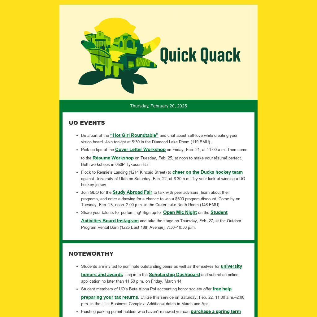 Pick up tips at the Cover Letter Workshop on Friday, Feb. 21, at 11:00 a.m. Then come to the Résumé Workshop on Tuesday, Feb. 25, at noon to make your résumé perfect. Both workshops in 050P Tykeson Hall.
