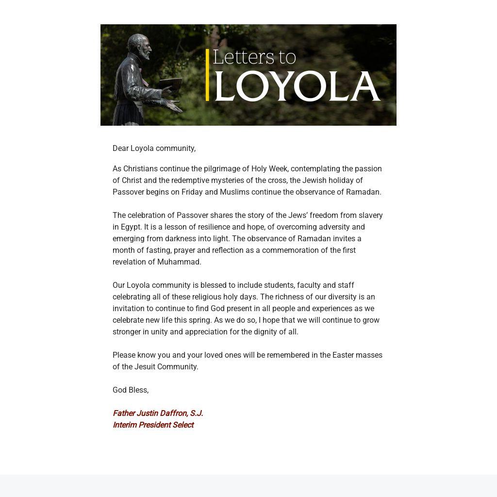 Our Loyola community is blessed to include students, faculty and staff celebrating all of these religious holy days. The richness of our diversity is an invitation to continue to find God present in all people and experiences as we celebrate new life this spring. As we do so, I hope that we will continue to grow stronger in unity and appreciation for the dignity of all.
