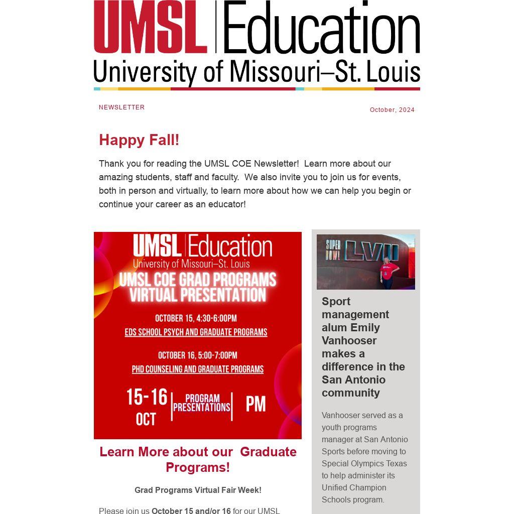 Thank you for reading the UMSL COE Newsletter! Learn more about our amazing students, staff and faculty. We also invite you to join us for events, both in person and virtually, to learn more about how we can help you begin or continue your career as an educator! |