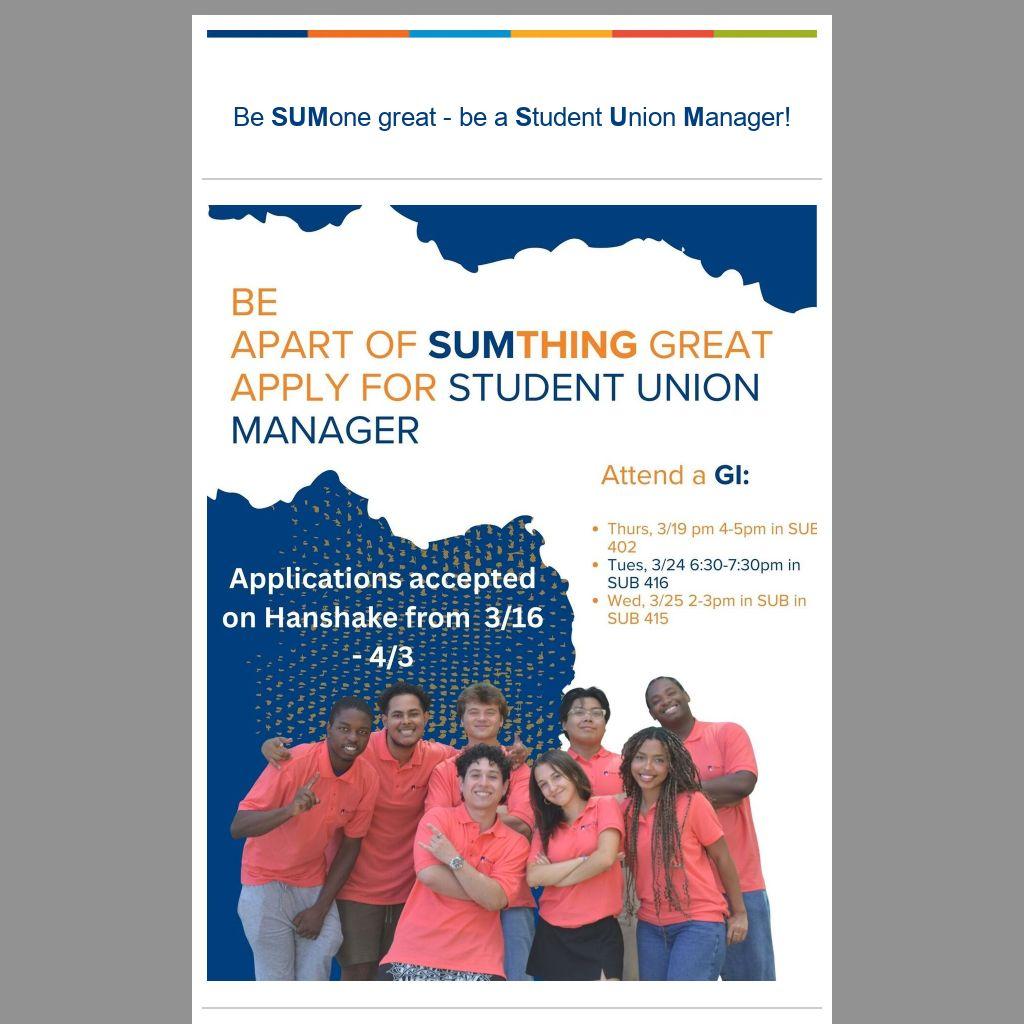 Student Union Managers manage all aspects of the Student Union during morning, evening, and weekend hours, assist students and faculty/staff with event/program logistics, and maintain relationships with various campus departments and student organizations to help communicate essential information. Student Union Managers work in a fast-paced environment, and must be able to manage multiple tasks at once.