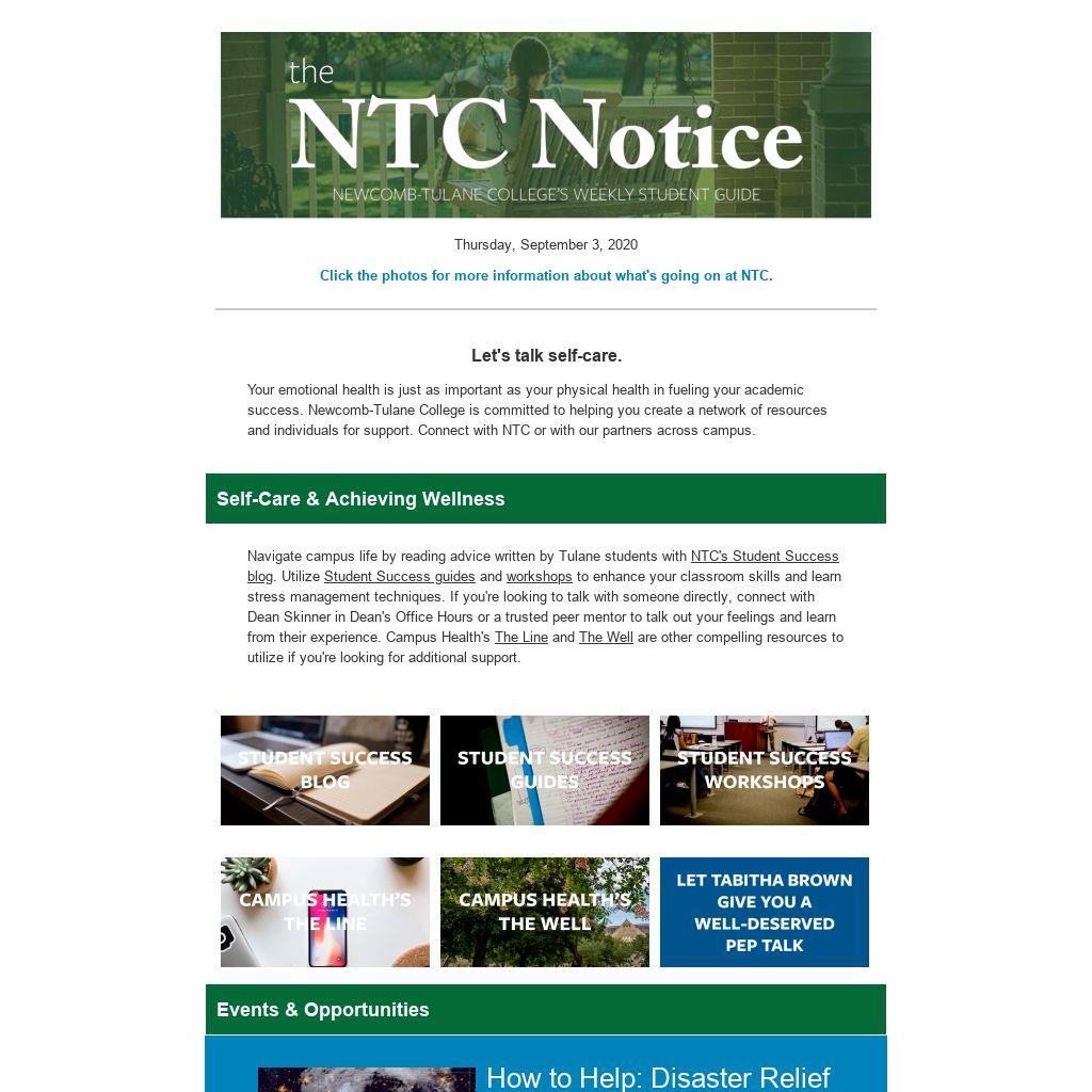 Navigate campus life by reading advice written by Tulane students with NTC's Student Success blog. Utilize Student Success guides and workshops to enhance your classroom skills and learn stress management techniques. If you're looking to talk with someone directly, connect with Dean Skinner in Dean's Office Hours or a trusted peer mentor to talk out your feelings and learn from their experience. Campus Health's The Line and The Well are other compelling resources to utilize if you're looking for additional support.
