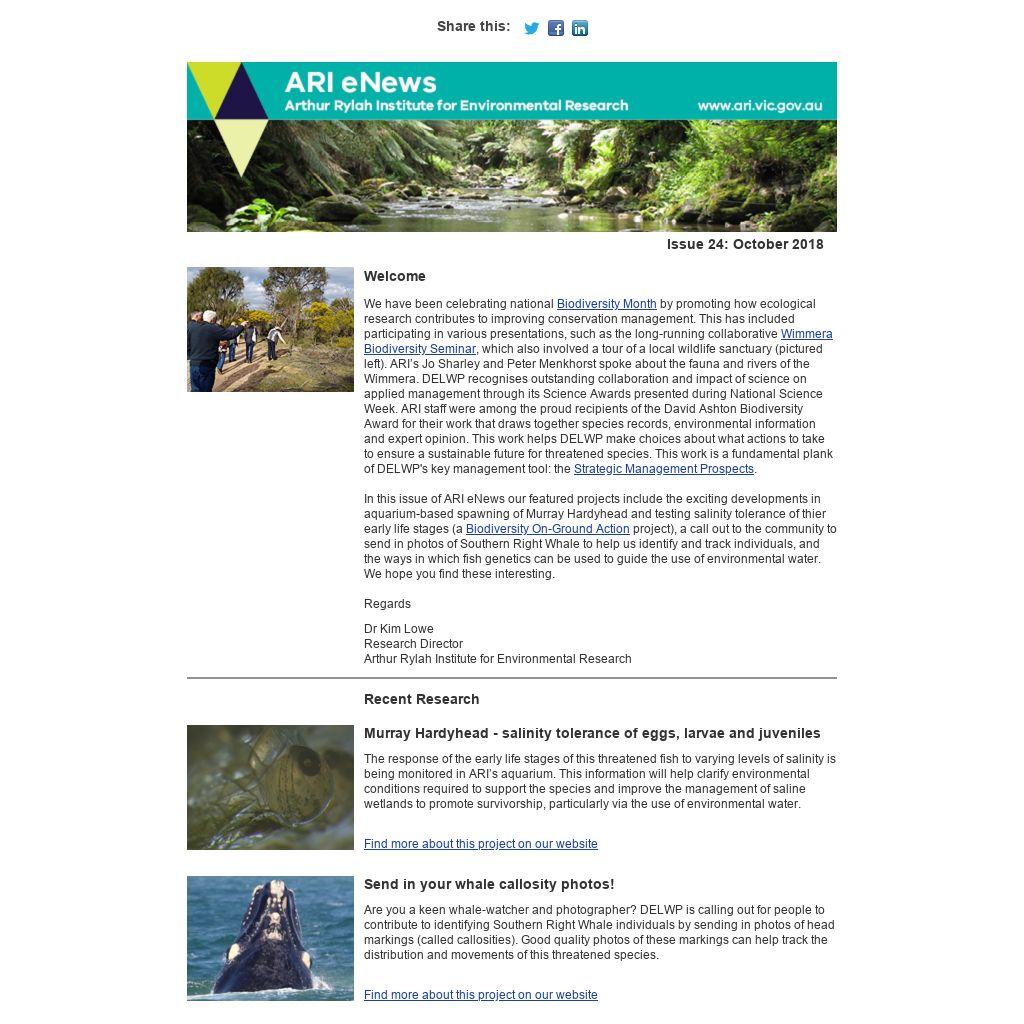 In this issue of ARI eNews our featured projects include the exciting developments in aquarium-based spawning of Murray Hardyhead and testing salinity tolerance of thier early life stages (a Biodiversity On-Ground Action project), a call out to the community to send in photos of Southern Right Whale to help us identify and track individuals, and the ways in which fish genetics can be used to guide the use of environmental water. We hope you find these interesting.