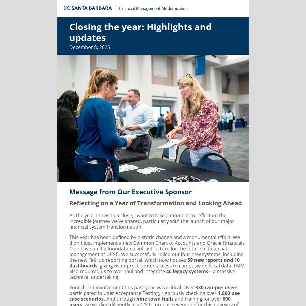 Your direct involvement this past year was critical. Over 330 campus users participated in User Acceptance Testing, rigorously checking over 1,800 use case scenarios. And through nine town halls and training for over 600 users, we worked diligently in 2025 to prepare everyone for this new way of working.