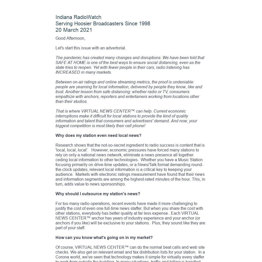 Of course, VIRTUAL NEWS CENTER™ can do the normal beat calls and web site checks. We also get on relevant email and fax distribution lists for your station. In a Corona world, we've seen that technology makes it simple for virtually every staffer to work from outside the building. In many situations, traffic and billing is handled somewhere else, and now you can have a larger sounding newsroom and not worry about all the issues that go along with a local hire.