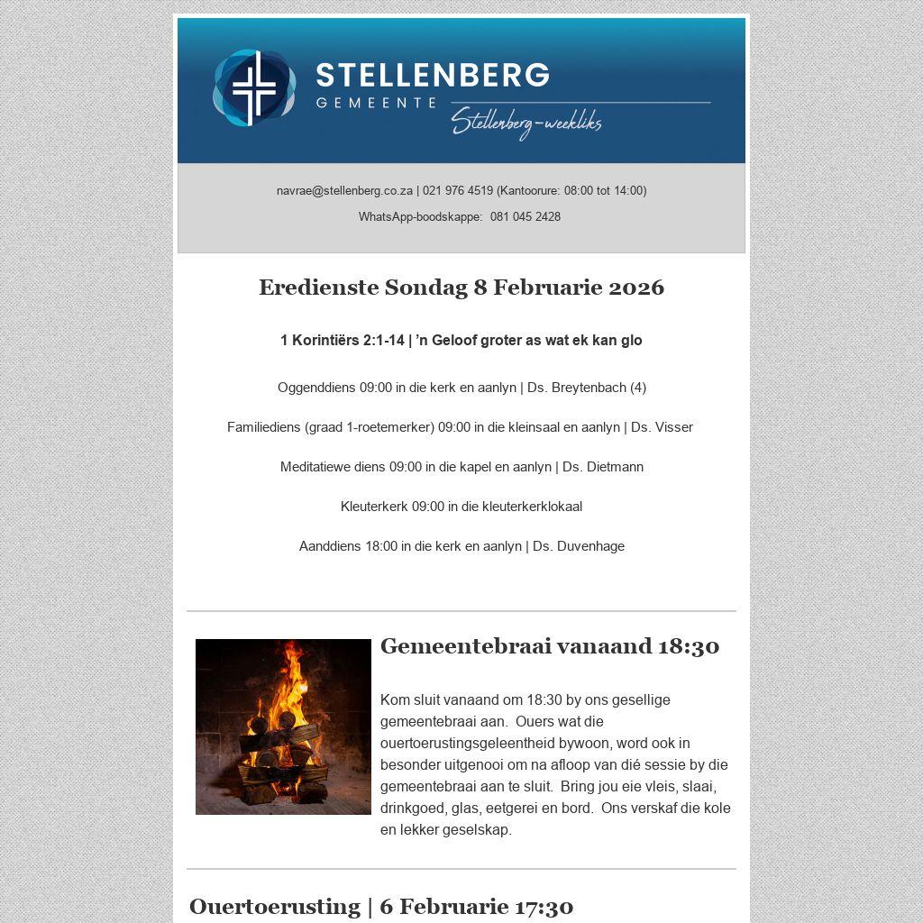 Jy kan gemeentenuus weekliks deur middel van die Stellenberg-weekliks per e-pos ontvang. Stuur jou e-posadres aan sanel@stellenberg.co.za. - Op jou selfoon: