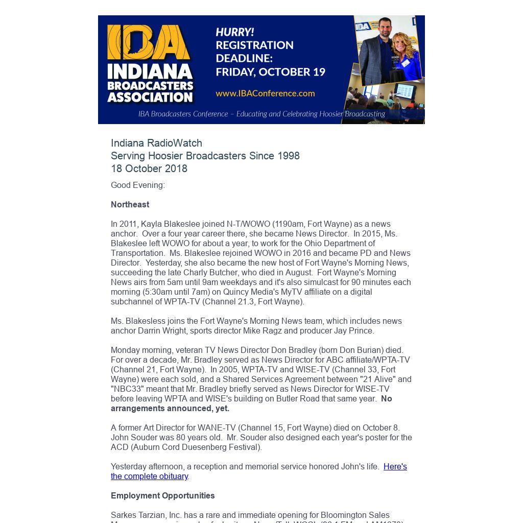 Indiana RadioWatch subscriptions are free. To subscribe, send an e-mail to irw@well.com and we'll add you. After publication, we archive Indiana RadioWatch on the Indiana Radio Archive at http://www.indianaradio.net. Please e-mail us your news stories and employment opportunities.