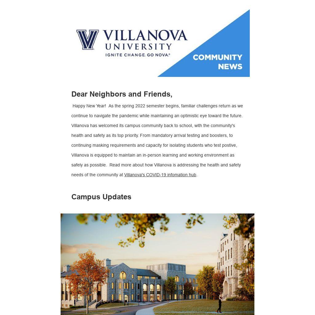 Dear Neighbors and Friends, Happy New Year! As the spring 2022 semester begins, familiar challenges return as we continue to navigate the pandemic while maintaining an optimistic eye toward the future. Villanova has welcomed its campus community back to school, with the community's health and safety as its top priority. From mandatory arrival testing and boosters, to continuing masking requirements and capacity for isolating students who test postive, Villanova is equipped to maintain an in-person learning and working environment as safely as possible. Read more about how Villanova is addressing the health and safety needs of the community at Villanova's COVID-19 infomation hub.