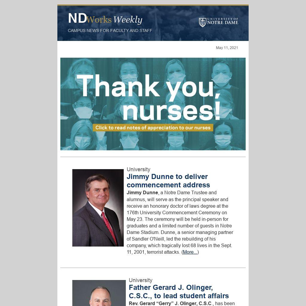 Jimmy Dunne, a Notre Dame Trustee and alumnus, will serve as the principal speaker and receive an honorary doctor of laws degree at the 176th University Commencement Ceremony on May 23. The ceremony will be held in-person for graduates and a limited number of guests in Notre Dame Stadium. Dunne, a senior managing partner of Sandler O'Neill, led the rebuilding of his company, which tragically lost 68 lives in the Sept. 11, 2001, terrorist attacks. (More...)