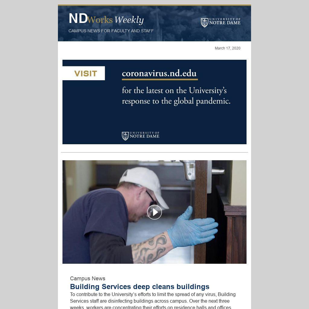 To contribute to the University’s efforts to limit the spread of any virus, Building Services staff are disinfecting buildings across campus. Over the next three weeks, workers are concentrating their efforts on residence halls and offices while also thoroughly cleaning other facilities. They are disinfecting door handles, sinks, countertops, and other surfaces that people touch and, in some places, they are using electrostatic disinfection.